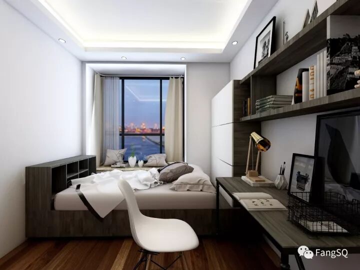 书房的设计之妙在于,充分利用窗台在旁边做一张榻榻米,一个简易书架,和一张简单的书桌,一个小书房空间就有了,书房做的是一个隐形门,也可以做客房。
