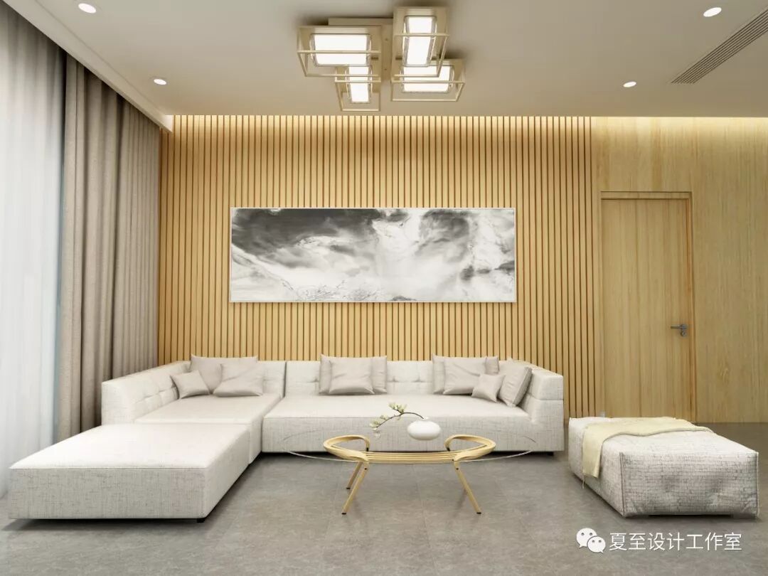 沙发背景墙大面积木条的阵列给人静谧的感受,在灯带的照射下形成特别的光影效果。一幅泼墨画成为客厅的点睛之笔。