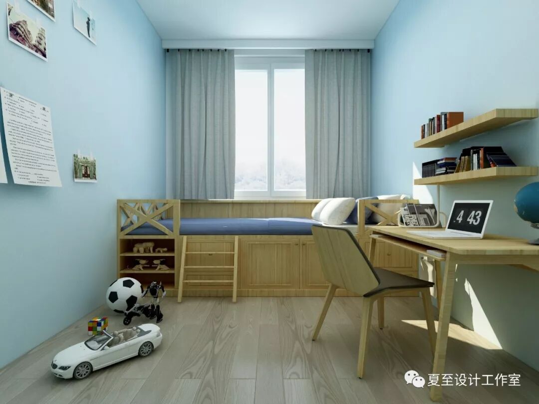 儿童房考虑男孩子的喜好,在儿童房做了天蓝色墙纸,搭配木色榻榻米床和原木书桌椅形成了一个属于孩子的空间。