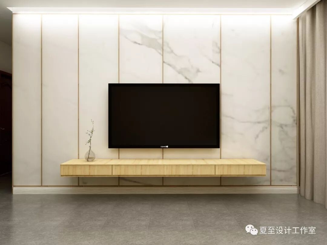 客厅电视背景墙采用鱼肚白大理石,再加上红铜的线条点缀形成规律。