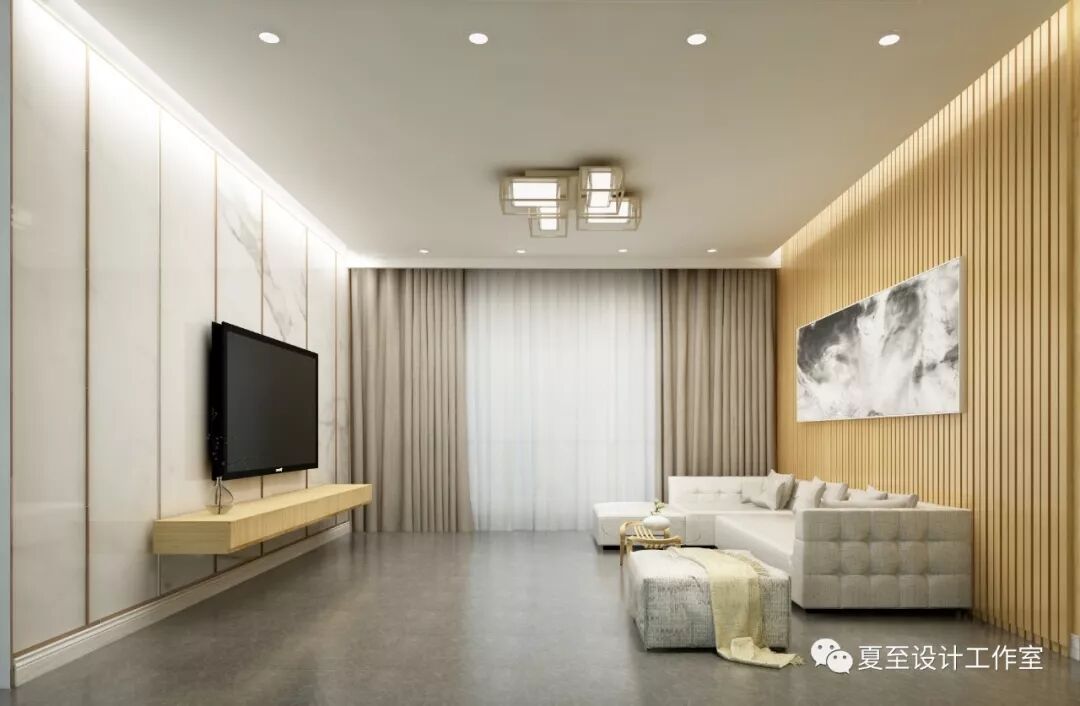 客厅采用大理石和木条的结合,天花在两面背景墙做了暗藏灯带,让洒下来的灯光效果柔和而又特别。木色背景墙和木色电视柜衬托,白色布艺沙发搭配轻盈的玻璃茶几。整个空间形成一种意境。