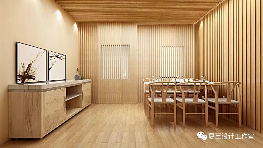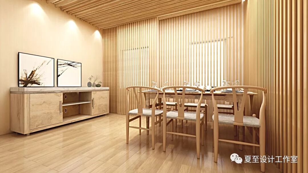 餐厅以静谧的木色调为主,木条的排列和延伸形成的光影变化温暖而带有一种意境。