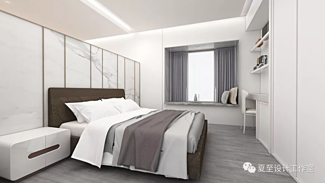整个空间灰白的色调让人放松,整片衣柜与梳妆台很好的结合。飘窗也让房间多了一抹光亮。