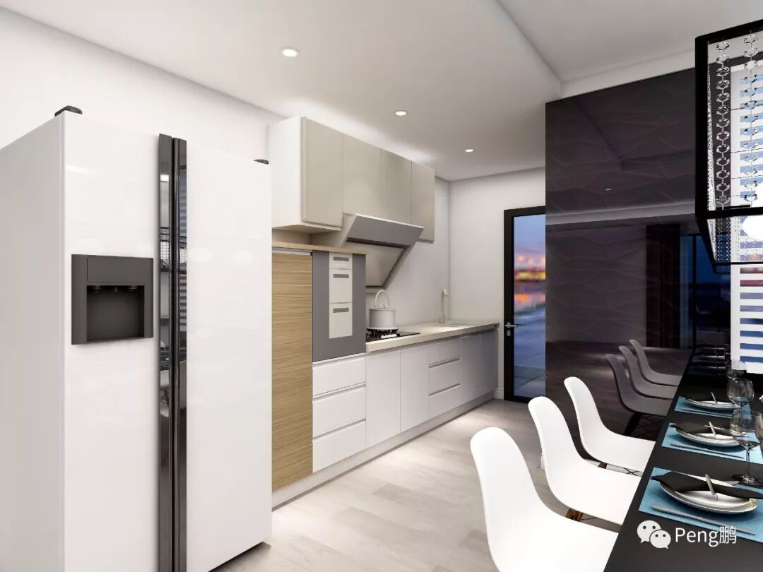 餐厅,厨房跟客厅一起也是作为一个整体的公共空间,由于原来厨房的空间是一个长方形的空间,显得十分的窄小,他的采光效果也十分的差,所以我把厨房打了做一个开放式的厨房,让厨房宽敞了许多,餐厅在厨房的隔壁,端菜上菜也方便许多。