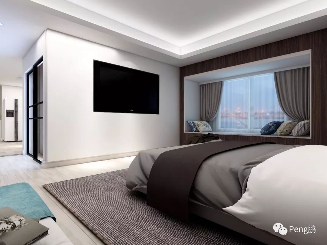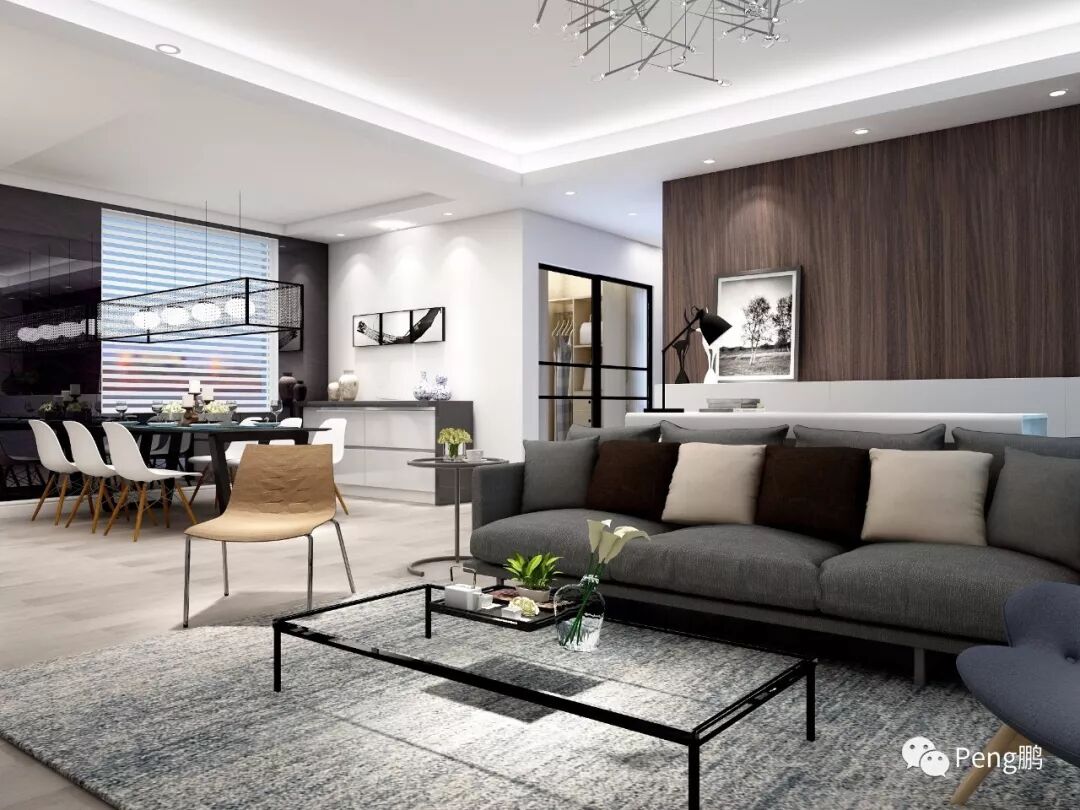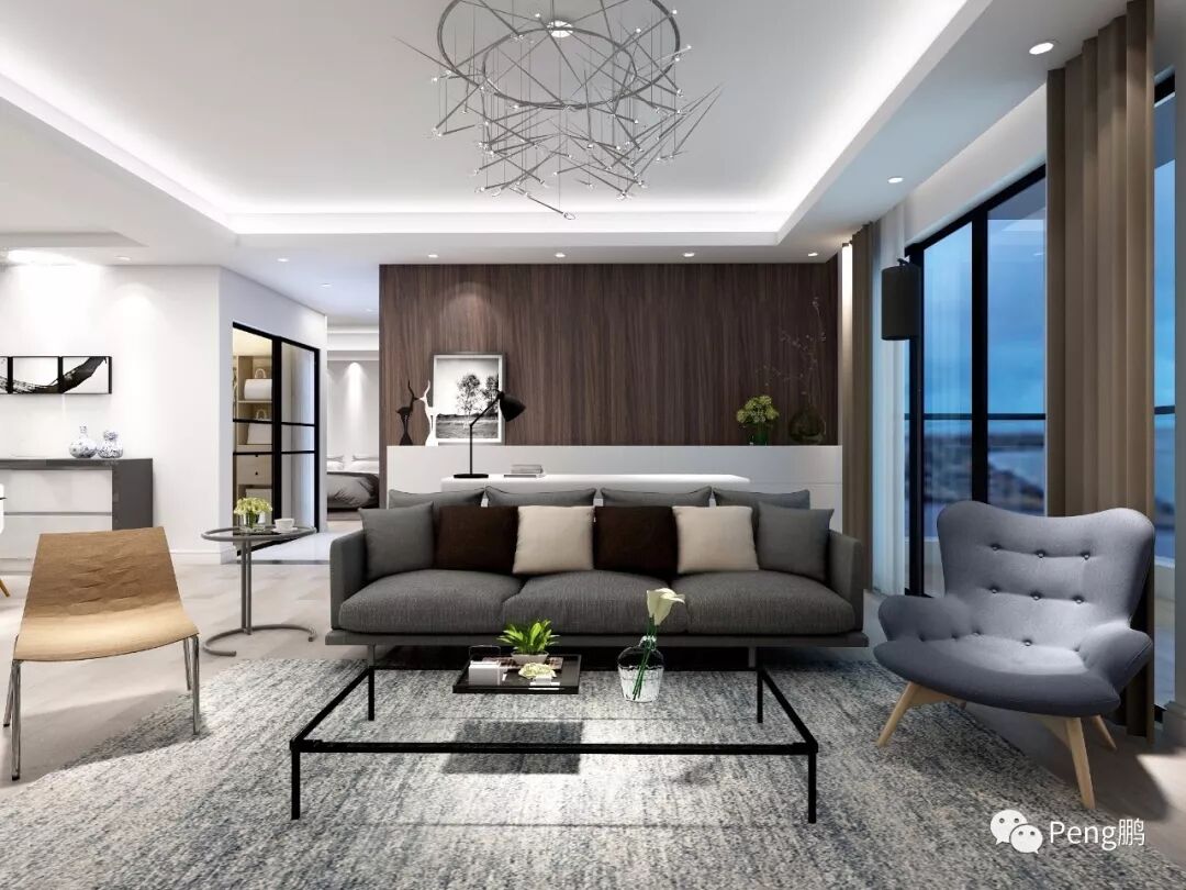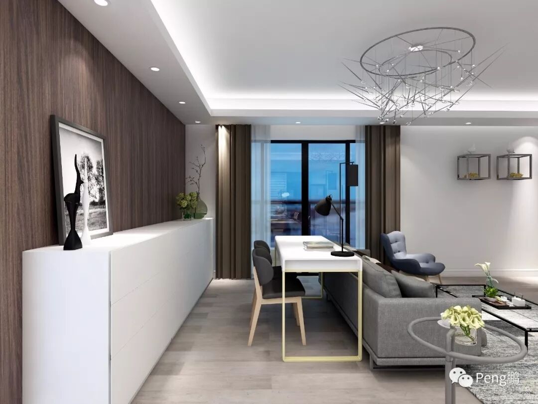 整体的设计风格我还是偏向轻装修重装饰,墙体都是一整块的没有做切割,家具装饰多点。整体色调白色调为主题色调,灰色调过渡,深色的墙面压一压让它的层次感起来,让空间显得大气。