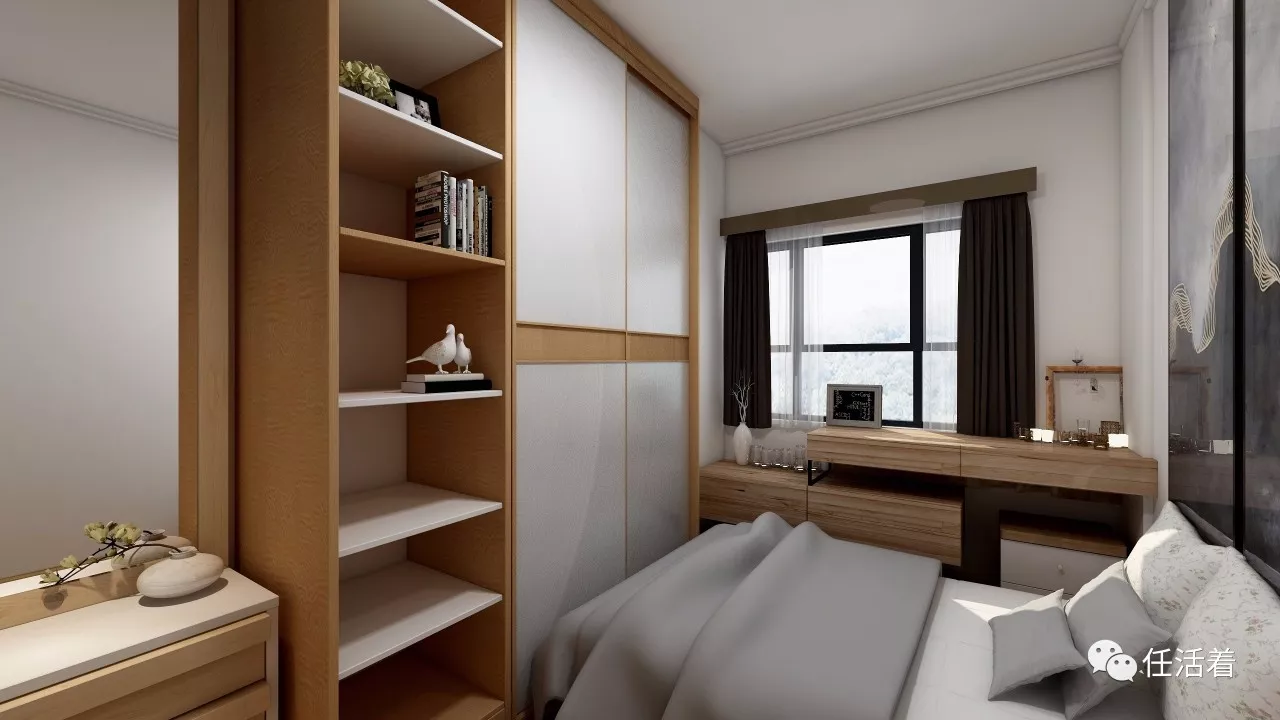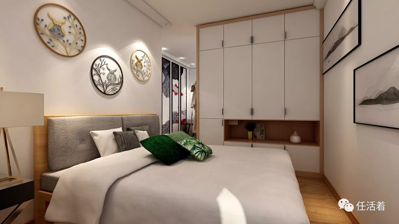 首先我们会看到左手边有一个衣帽架和一个鞋柜放在玄关旁边,方便业主安放衣服和鞋子。