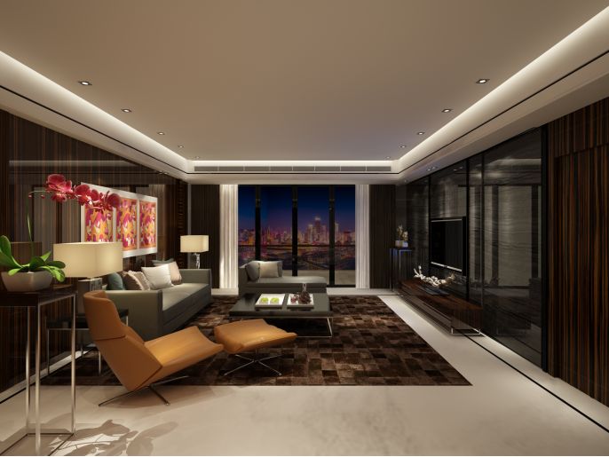 客厅整体开阔,阳光充足。配合大理石地板,经过处理的木饰面,个别色彩的跳动,使整个空间明亮自然。整体空间布局明确、大气、顺畅,大面积的木纹装饰墙面增加流动感,营造一种畅游无限的自然感。