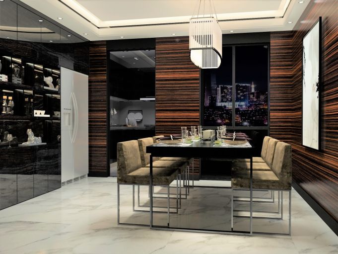 与客厅的统一贯彻,使客餐两厅合而为一,整体更加开阔自然。不变的元素,不变的基调,犹如不变的三餐,由客厅到餐厅,从餐厅到客厅,点亮到明亮,更加体现着一种“行”的理念。