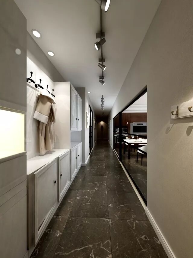 过道 我们运用过道分隔开了两个屋主人的常用空间,然后我们再进行对过道的设计,采用大理石的地砖,让人有一种轻奢的味道。