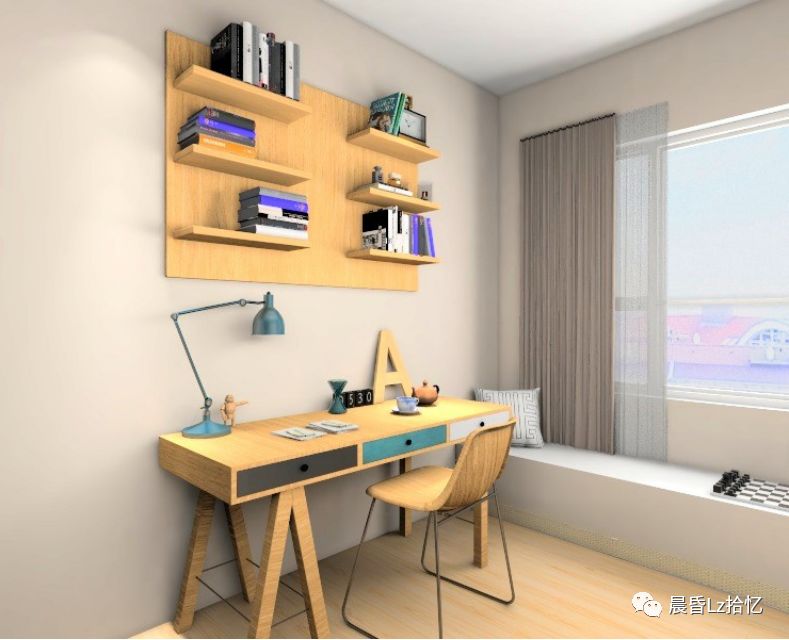 书房除了灰色墙,更多运用实木和金属结合,浅色的木地板,使得房间更加明亮。飘窗设计,让阅读多了一个地方选择。