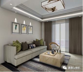 客厅利用了大面积灰色粉刷了墙面,与灰色的地板结合,又与白色的天花板形成对比,显得空间开阔。留白的墙面,打破成片灰色带来的压抑感,比墙面较为深色的灰窗帘,为空间带来层次感。天花板的暗藏灯带和筒灯弥补因为天气原因导致的采光不足;中间中国风的吸顶灯,不仅与灰色相呼应,还点缀天花板。