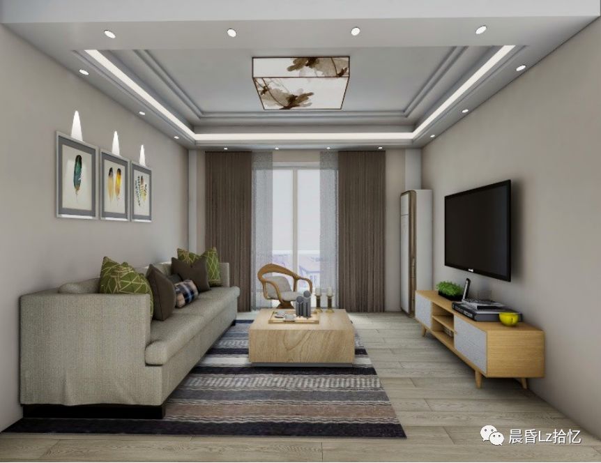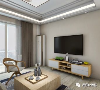 灰色亚麻沙发搭配不同颜色的抱枕,电视柜的绿植,与羽毛挂画交相辉映,打破空间的沉闷感,显得生动活泼带有一丝俏皮。实木的茶几和电视柜让空间变得稳重。