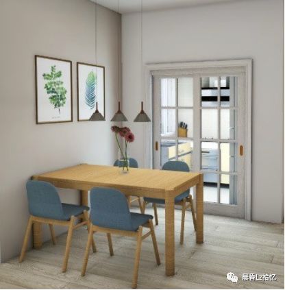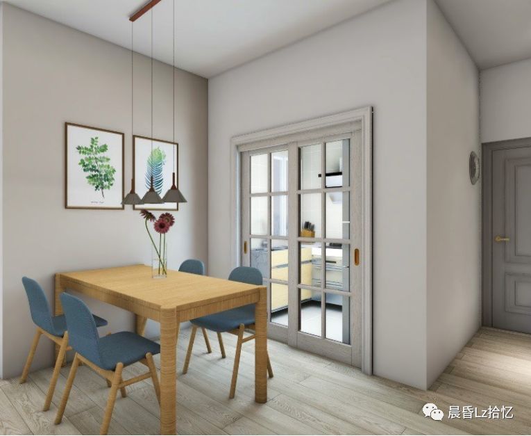 餐厅一面灰色墙,与客厅对应,白墙做了空间分隔,区分餐厅和厨房。没有过多的家具,节省了空间,又让空间“变”大。