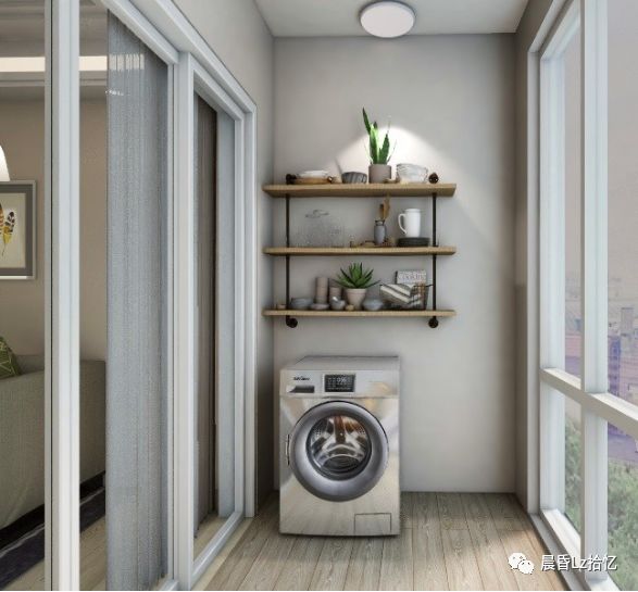阳台是一个狭窄又狭长的空间,为更好利用空间,在两边布置了不同的使用功能。面向窗外的左边,是洗衣间,解决洗衣问题,置物架上可以养小绿植,增加美观度。