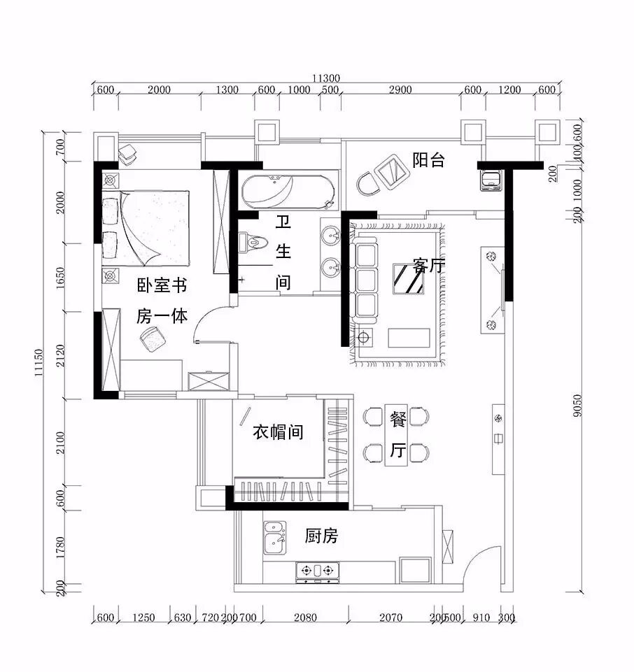 为了更适合业主的居住要求,我们在布局上做了很大的调整,强调了空间的融合。书房和卧室连一体,使得卧室的空间变的更丰富。 大的卫生间提升居住的品质,衣帽间与卫生间的窗户通透,使空气更好的对流,客厅与餐厅厨房相连,让空间变的更通畅明亮。