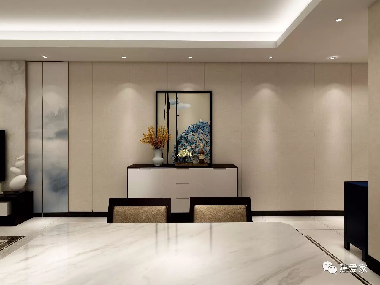 餐厅--从玄关进入我们可以看到木饰面板连接着我们的餐厅客厅,使之连成一体,让得空间更加流畅,黑白色调让客厅和餐厅更好的融合,让餐厅、客厅变的更大气。再衬上一侧的挂画,使整个空间倍添高贵的气质。