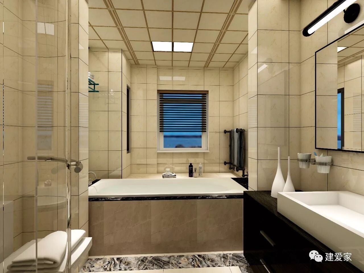 卫生间--采用米白色构建,且将卫生间进行了改造,使其有9m²,放一个大的浴缸,让业主下班回到家可以在这个大的空间泡一个热水澡,放松自己。
